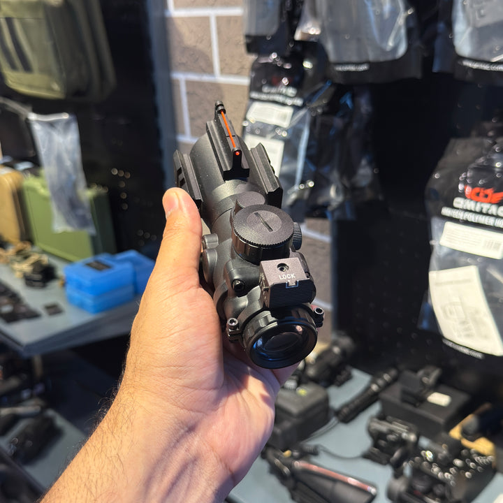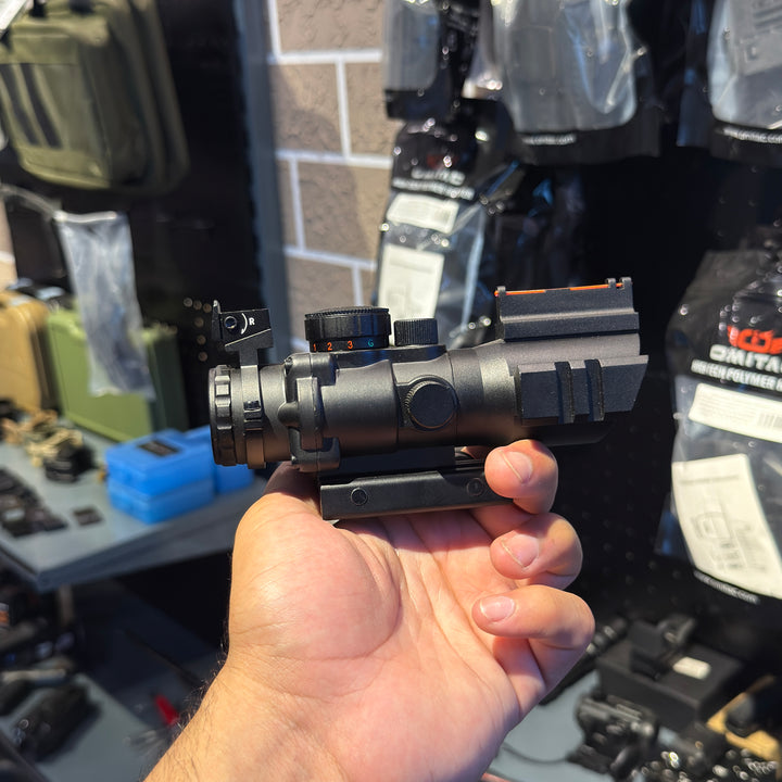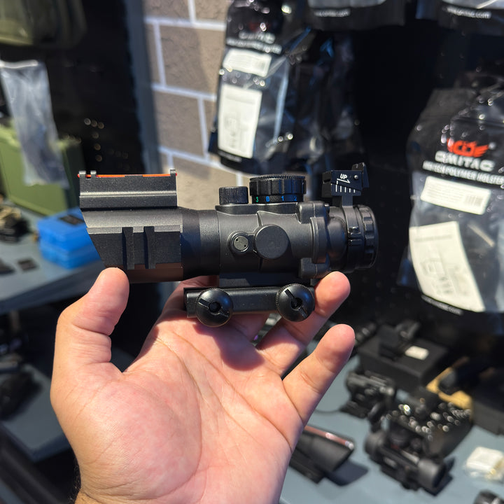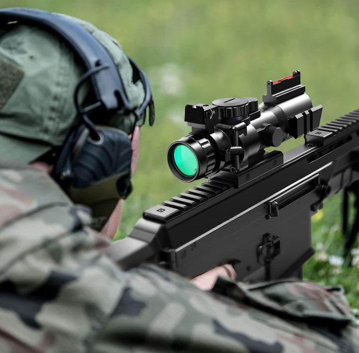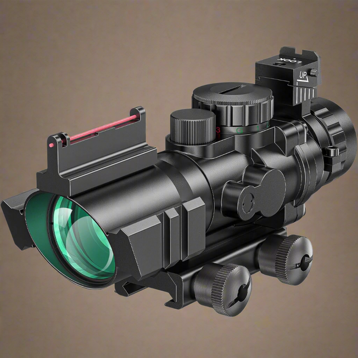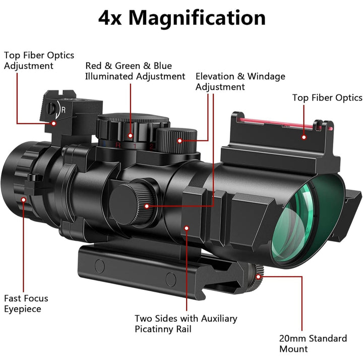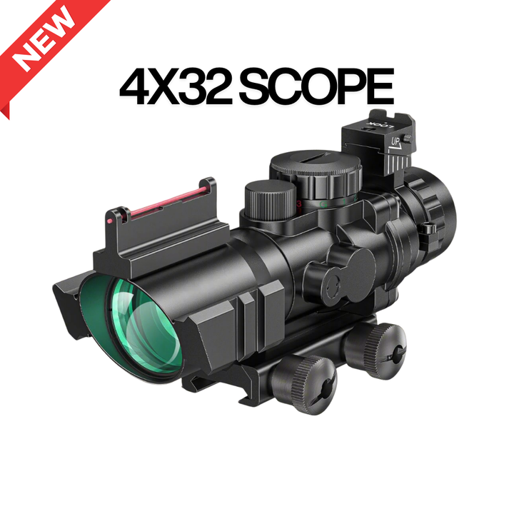 This high-performance 4x32 scope features fiber-optic sights for swift and precise target acquisition.