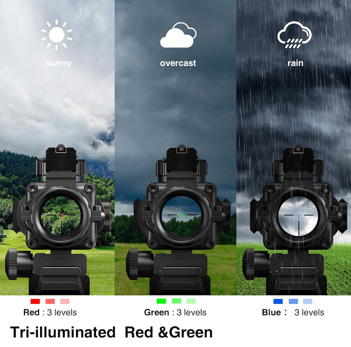 The reticle is illuminated in red, green, or blue with three brightness settings to adapt to varying light conditions.