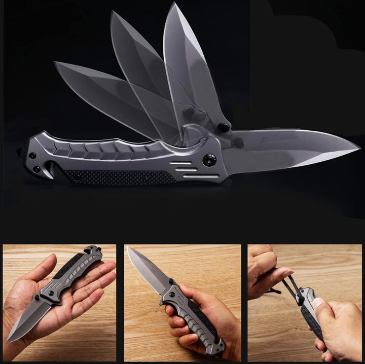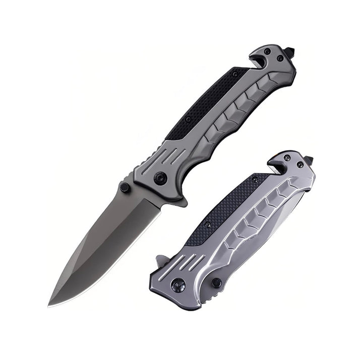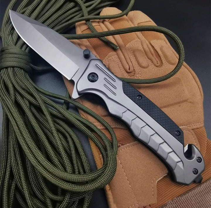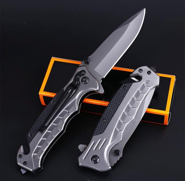 - 3-in-1 multifunctional rescue knife. 3-in-1 function: this is not just an outdoor knife. Both a glass breaker and a belt cutter are integrated at the bottom end of the handle. These emergency hammer elements can save lives in case of accidents!