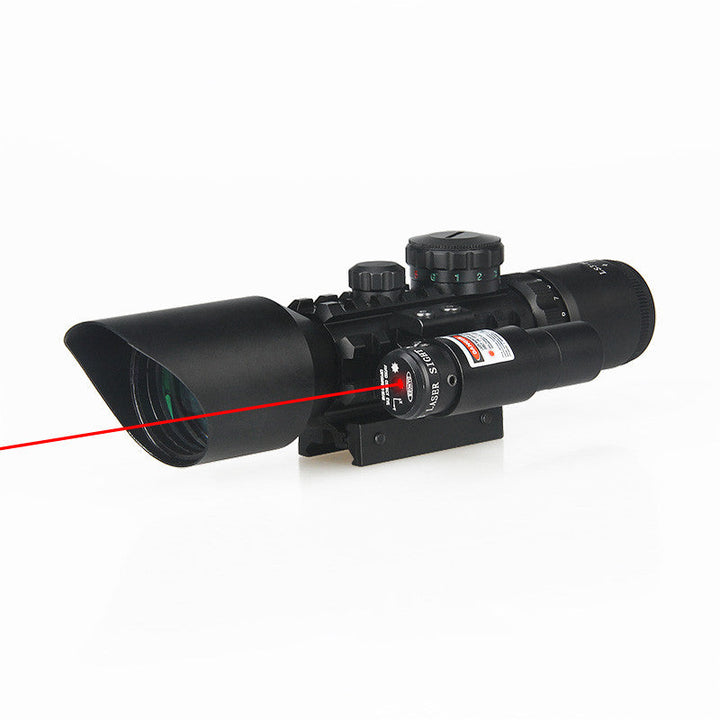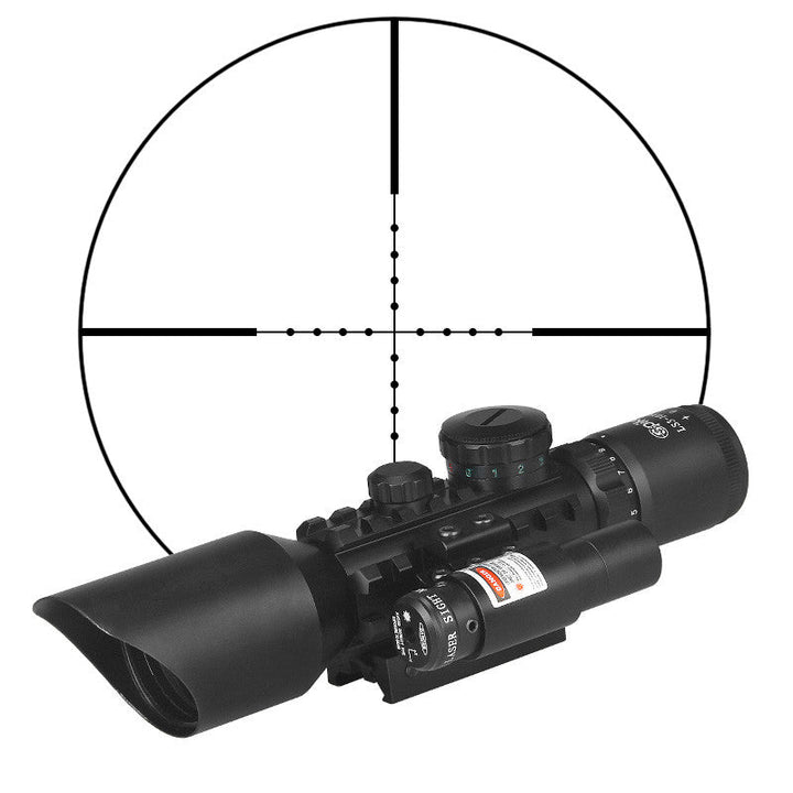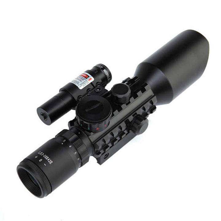 The Reticle Scope with Laser and Rail Mount | LS3-10X42E is suitable for various rifles with a Picatinny rail mount, including the M4, AK, and M16. Its 3x-10x magnification and 42mm objective diameter offer precise and unobstructed views. Plus, with a tube diameter of 25.4mm and dimensions of 210*85*60mm, it is both durable and compact. The LS3-9X40E YG model has a φ40mm objective lens and 100yds parallax correction. The click value is 1 click 1/2", and the elevation/windage adjustment range is ≥40moa. This scope can withstand impacts up to 800g and has a reticle displacement of ≤0 after shock. The required battery is a 3V CR2032 (battery not included).